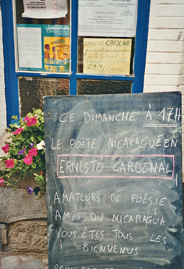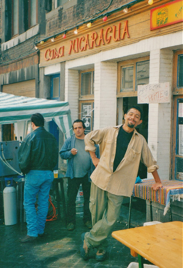 … la CASA NICARAGUA ouvrait ses portes, après 6 mois de rafistolage, bricolage pour qu’une seule pièce, celle de devant, soit praticable. Le plafond qui pendait avait été remonté et fixé par deux planches historiques que l’on peut encore contempler, des couches de balatum arrachées, le plancher nettoyé, poncé, teint et verni, les murs blanchis, les boiseries peintes en bleu Méditerranée, un bar en vieilles briques édifié, un poêle à bois placé avec gravée, l’effigie de Sandino.